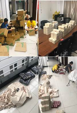 八点四十分,在朦朦细雨中,昌平校区的师生志愿者在何欣副经理带领下按照分工有序前往分布在校内校外4个的宿舍区域的近80个宿舍,正式开始了毕业生行李物品整理工作,杨杰副经理则在学院路校区带领师生志愿者同时开始了紧张有序的行李物品整理工作。为保证整理工作的顺利开展,学院提前为志愿者们配备了充足的物资,不仅有必备的剪刀、胶带、捆绳,还有一次性口罩、消毒湿巾、鞋套、防尘帽等,并为各个宿舍全程直播整理打包行李工作提供了手机支架等。